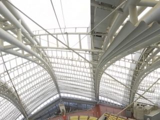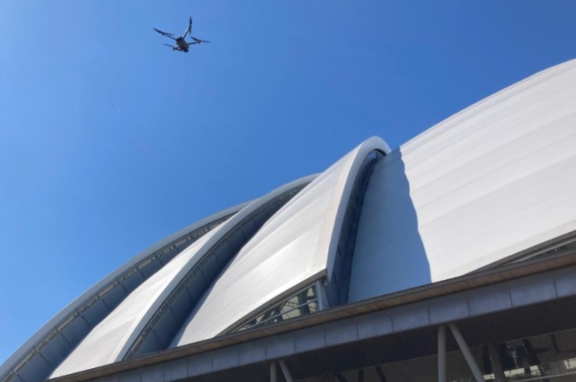 特徴的な屋根のため点検作業には難しさが伴う。内装では、グラウンド面から天井まで約51mの高さがあり、足場を組むと費用も時間もかかり危険も伴う。外装面だけを点検しても、開閉式の構造を持ち、点検しきれない。今回は漏水箇所の特定を目指したため、雨水の侵入経路となる屋根の外装面に加え、屋根から入った雨水が屋内にしたたる内装面側(天井側)からもそれぞれ別々のドローンを使って点検した。