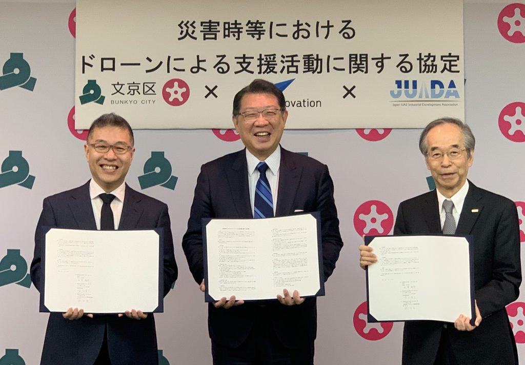 文京区(東京都)と区内に本社、本部を構えるブルーイノベーション株式会社(東京)、一般社団法人日本UAS産業振興協会(JUIDA、東京)は災害時のドローンによる支援に関する協定を締結した。文京区が区内事業者として声をかけて協定が実現した。文京区は23区の中でも高低差が大きいエリアで、ドローンによる物資運搬や情報収集などで災害活動支援の体制を構築する。JUIDAは文京区との協定締結をきっかけに、今後23区との連携拡大を図る考えだ。