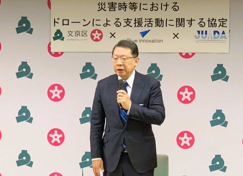 さらにJUIDAの鈴木代表理事は「日頃お世話になっている地元・文京区の安全、安心に対し、われわれのもつドローン技術で貢献できることは組織としてこのうえない喜びであり社会的意義を感じています。われわれは災害支援、対策を全国で推進して参りました。その中でも、いつ起きてもおかしくない首都直下型地震への対策は喫緊かつ最優先課題ととらえています。JUIDAにとって今回の協定は東京都内の自治体として初めての協定で、都内全域の防災力を高めるための歴史的な第一歩になると確信しています」と協定の意義を歴史的一歩と位置付けた。