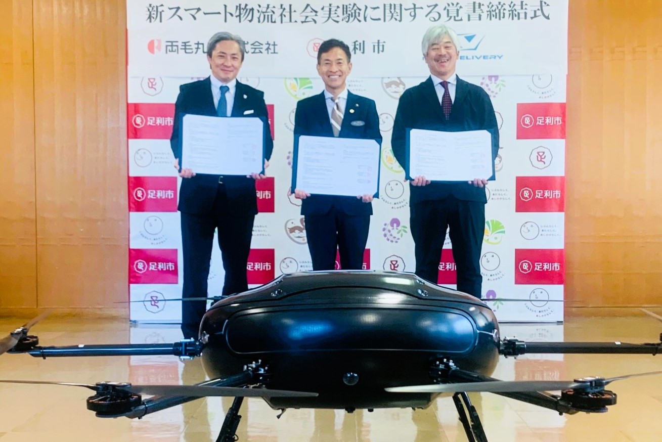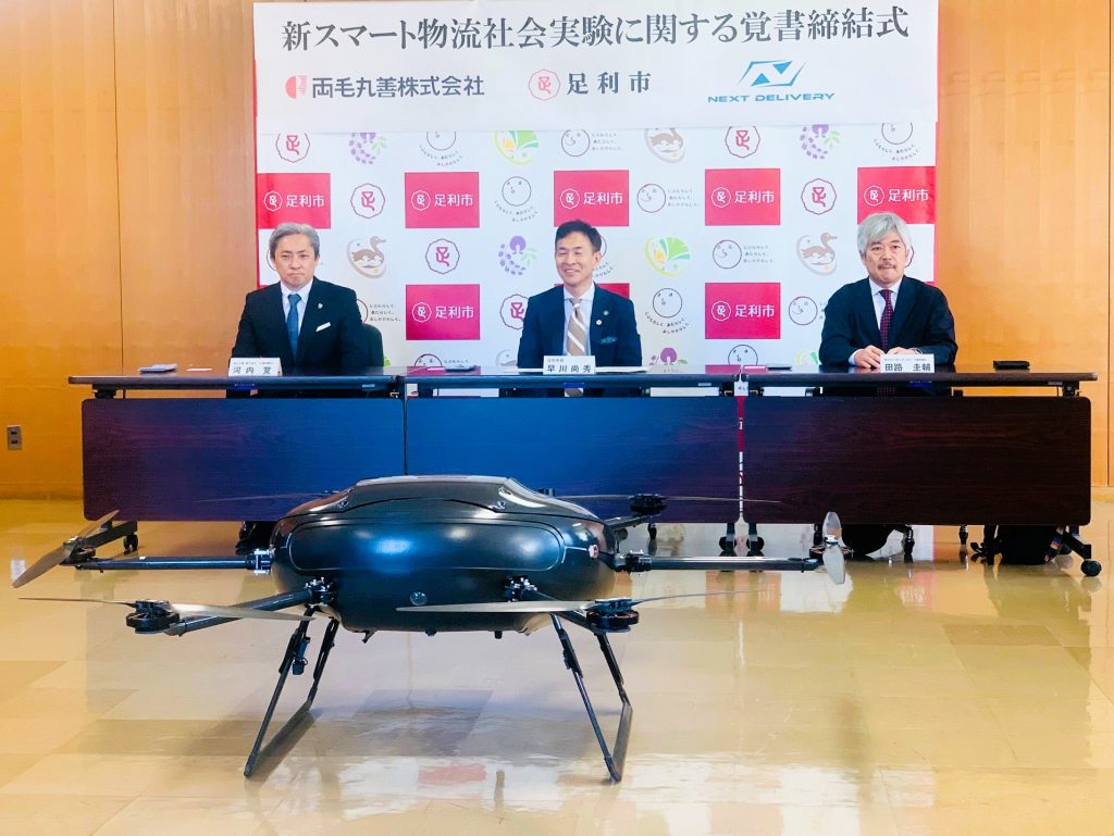 ドローン物流と既存物流を融合させた「新スマート物流」を提唱、展開している株式会社NEXT DELIVERY(小菅村<山梨県>、田路圭輔代表取締役)は10月8日、足利市<栃木県>、足利市内で燃料小売などのカーライフサポートを手がける両毛丸善株式会社 (河内覚代表取締役)と3者で、足利市内での新スマート物流の実施を見据えて「新スマート物流社会実験に関する覚書」を交わした。ドローン事業専門の部署を持つ両毛丸善がドローンの運航を担う。災害時にも通常時にも物流機能を担う運用を目指し、飛行ルートの検証などの可能性を探る。早ければ来年(2026年)1月にも運航に着手する。