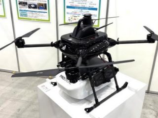 展示会場では三菱重工業が、200㎏の重量の荷物を運べる大型ハイブリッドドローンがひときわ目立っている。25日には同型のハイブリッドではないドローンで150㎏の荷物を吊り下げて飛行する模擬飛行に挑む。