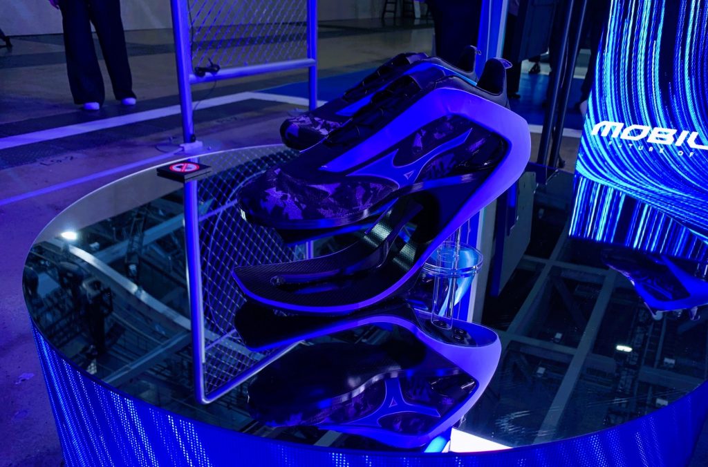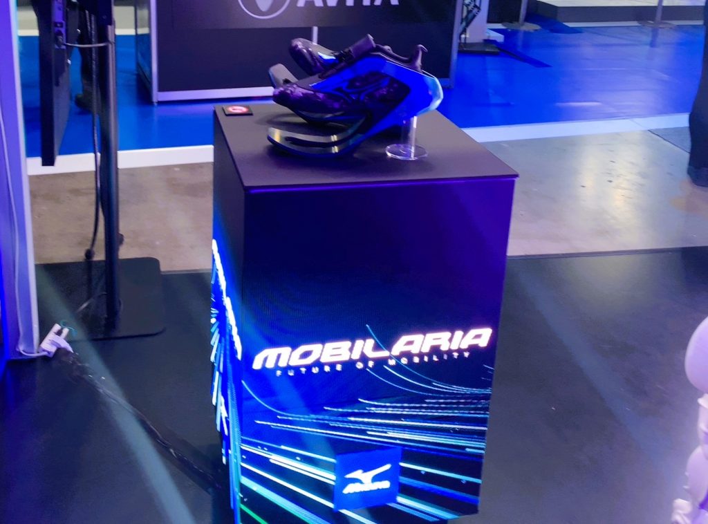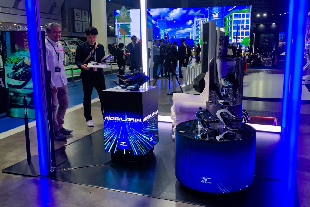 モビリティの多様性も目を引く。スポーツ用品開発のミズノ株式会社は、競技用義足の技術を応用し、一般にも移動用に使うことが想定されているシューズ型移動ギアを展示している。移動ギアはコンセプトモデル「MOBILLARIA β(モビラリアベータ)」でCFRP(炭素繊維強化プラスチック)のブレードをアッパー部と一体化させたシューズ型だ。いわばバネがついたシューズで、着用者の脚の力を効率的に伝える。タイヤがついているわけでも電力など動力で動くものでもない。