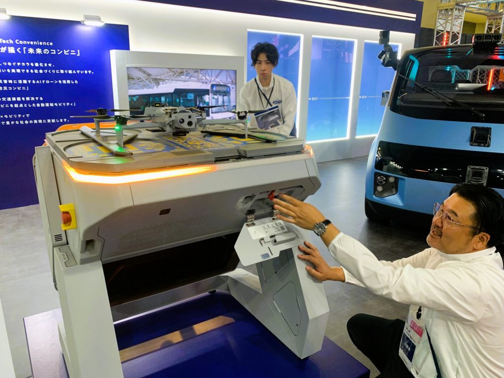 ドローンではKDDI株式会社が、米国Skydio社製の自律航行をするAIドローン「Skydio X10」と離発着基地となる格納庫「Skydio Dock for X10」を設置し、来場者の要望に応じ「Dock for X10」のフードが開く様子を見せる。同社は日本各地に合計1000機のドローンを配備し災害の発生時に10分で現場にかけつけられる体制を整える方針を発表しており、配備するセットを再現する形だ。10月には1000台配備の第一歩を能登で踏み出したことを発表している。来場者はアンケートに答えると、森永製菓株式会社のチューイングキャンディ「ハイチュウ」のオリジナルハイチュウ「MU-CHEW –ムチュウ-夢中-」がもらえる。