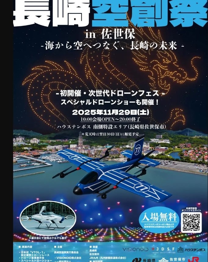 長崎空創祭2025を開催するのは、一般社団法人日本ドローンスポーツ連盟(山梨県)とVISIONOID株式会社(東京都港区)が構成する「長崎空創祭実行委員会」。「長崎空創祭2025」はVTOLレースを中心に「空の地域創生」をテーマとしたプロジェクトだ。教育コンテンツ、エンターテインメントを盛り込み、「ドローン×教育×エンターテインメントで地域創生に挑戦」を掲げる。