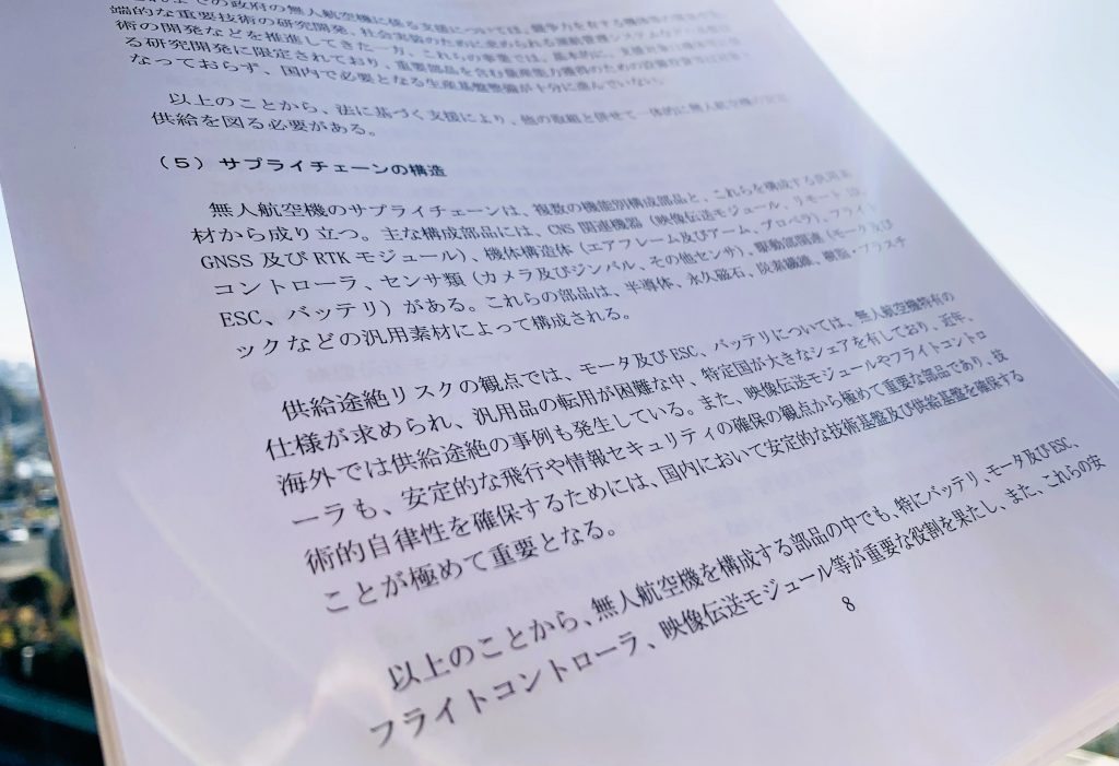 ドローン(取組方針では「無人航空機」と表現)については「経済安全保障の観点から極めて重要なインフラ」で「安定供給の確保が求められる」と明記。一方、日本のメーカーが製造した完成機体も、バッテリ、モータ及びESC、フライトコントローラ、映像伝送モジュールは「特定国の部品メーカーから調達している例が複数確認」されていて、「他国に供給を依存している状況と考えられる」と分析している。