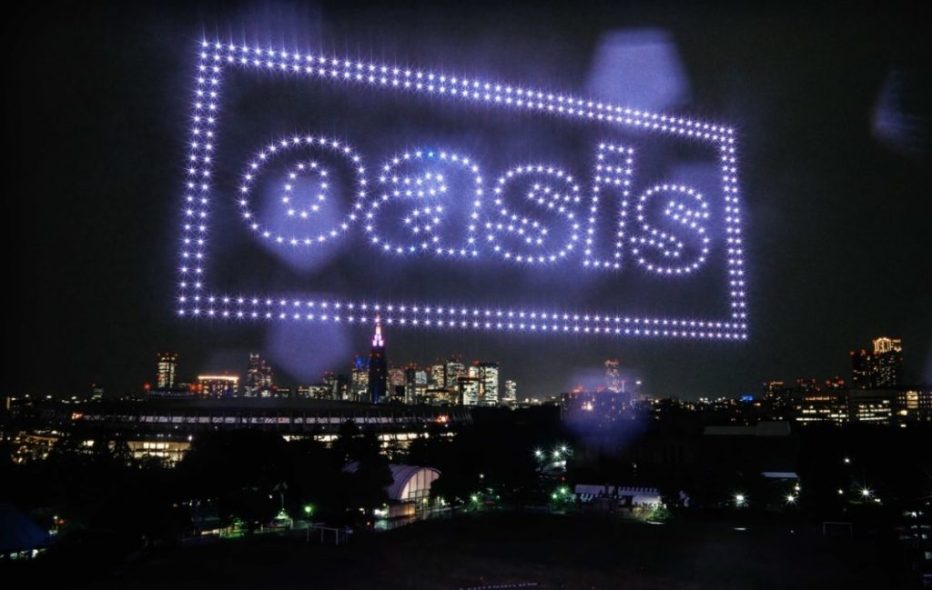 Oasisの来日公演が話題だが、開催の10月25、26を前にした10月24日、東京・外苑前の夜空にOasisのバンドロゴがドローンショーで浮かび上がった。ドローンショーによるロゴ投影は今年7月、ワールドツアーがスタートしたウェールズの首都カーディフのプリンシパリティ・スタジアムでも行われていて、7月4日の初日公演を翌々日に控える7月2日に、巨大ロゴで再結成を祝った。来日公演では代表曲「Don’t Look Back In Anger」のパフォーマンスでは会場である東京ドームでは、客席とともに音漏れを期待して駆けつけた会場の外のファンも含めた大合唱が起こる盛り上がりとなった。