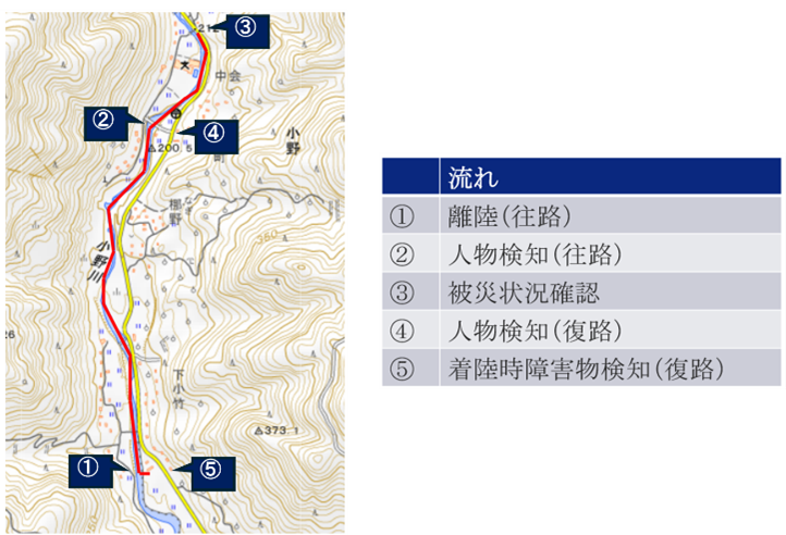 (2)着陸地点の安全性確認: 着陸地点にある障害物をAIが検知し、一時停止および通知。オペレーターの判断により別の安全な場所へ着陸。