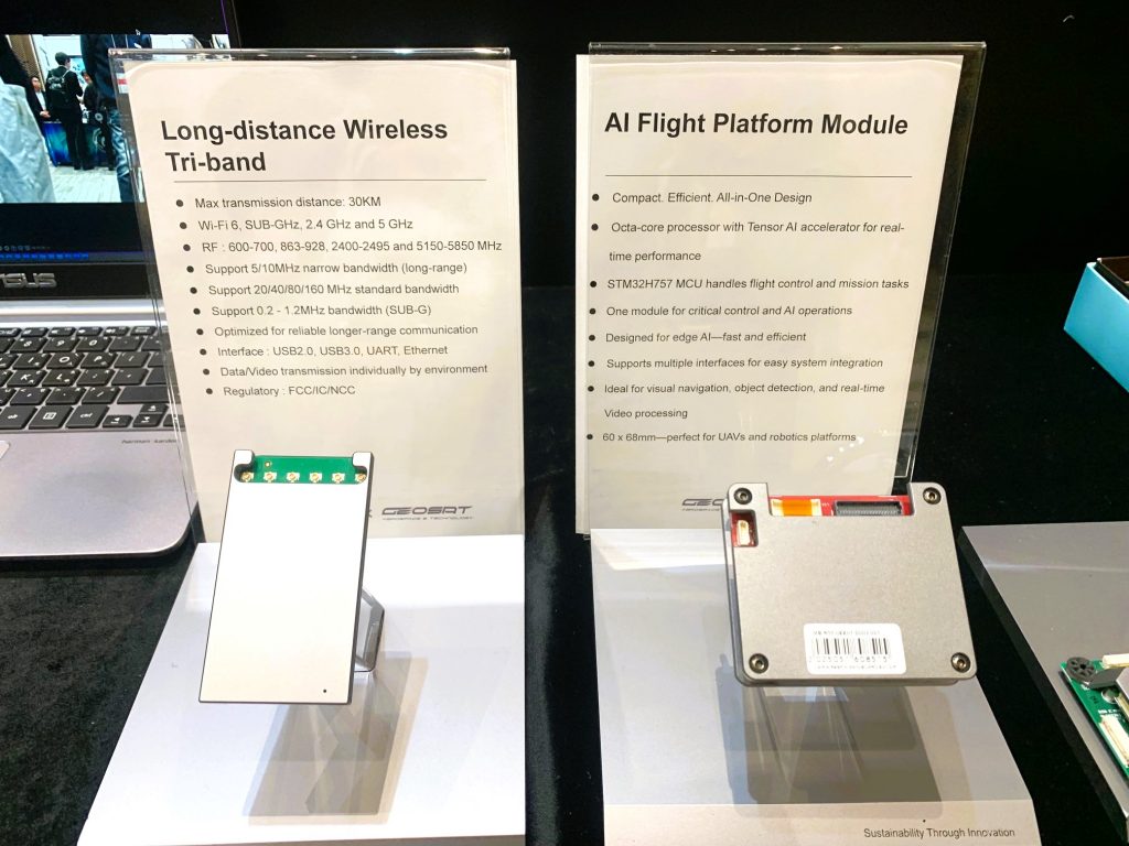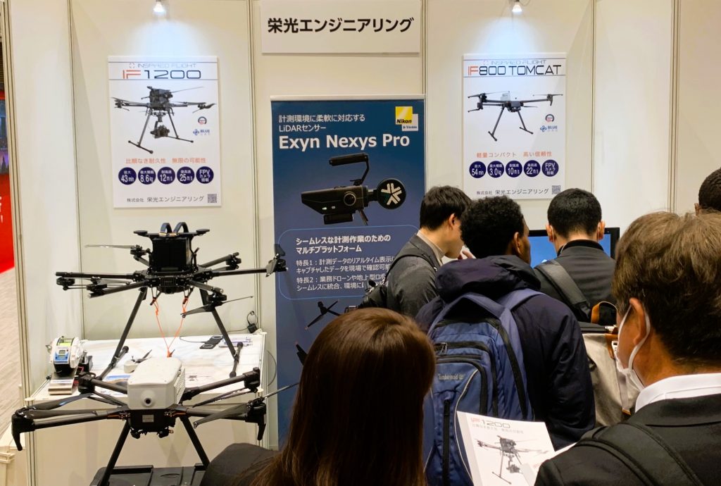 ブースでは大島社長らが機体の特徴などを来場者に説明していた。ブースではそのほかExyn Technologies社の自律飛行型3Dマッピングシステム「Nexys」「Nexys Pro」、Teledyne Optech社の軽量LiDARシステム「EchoONE」も展示している。